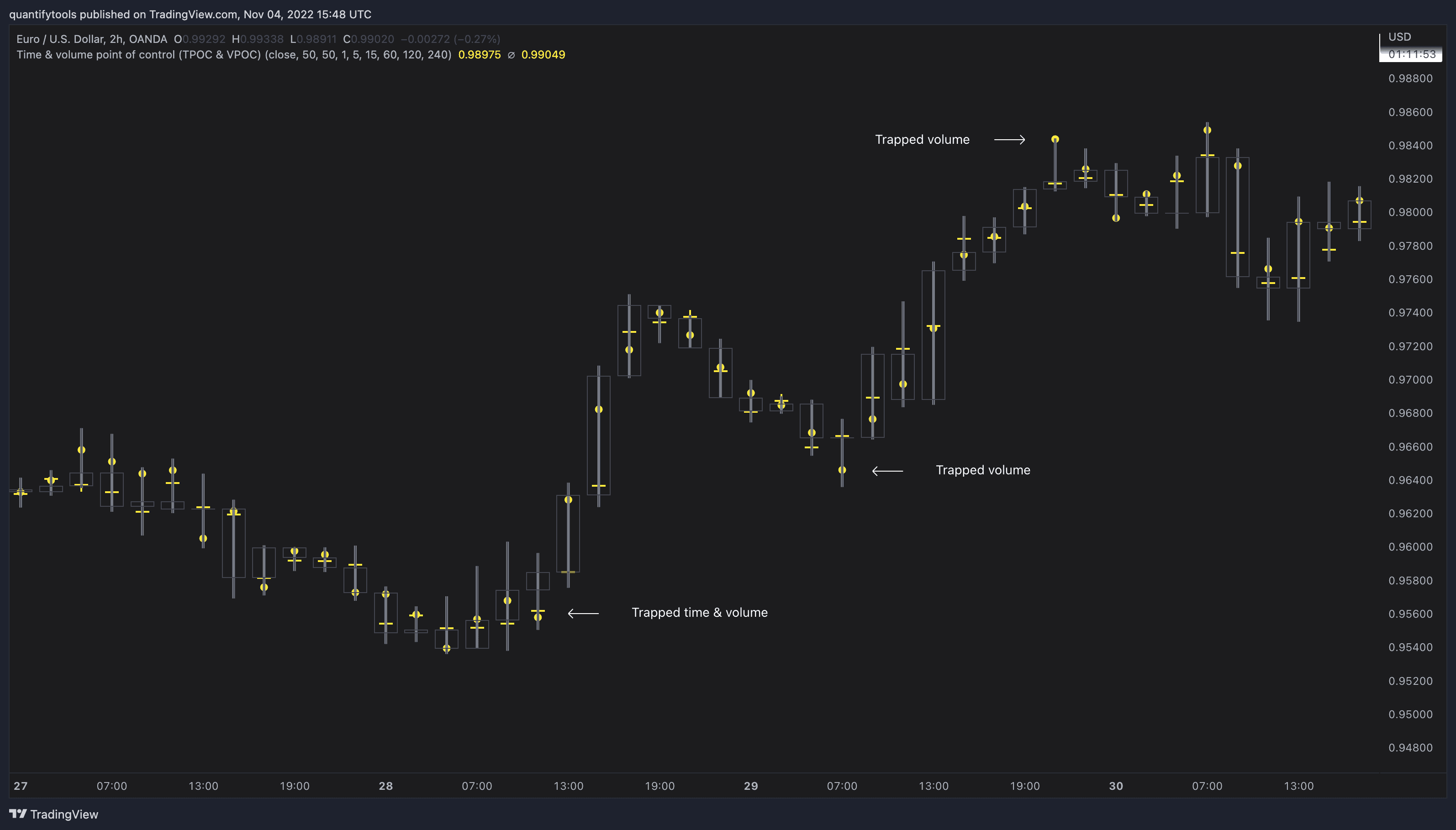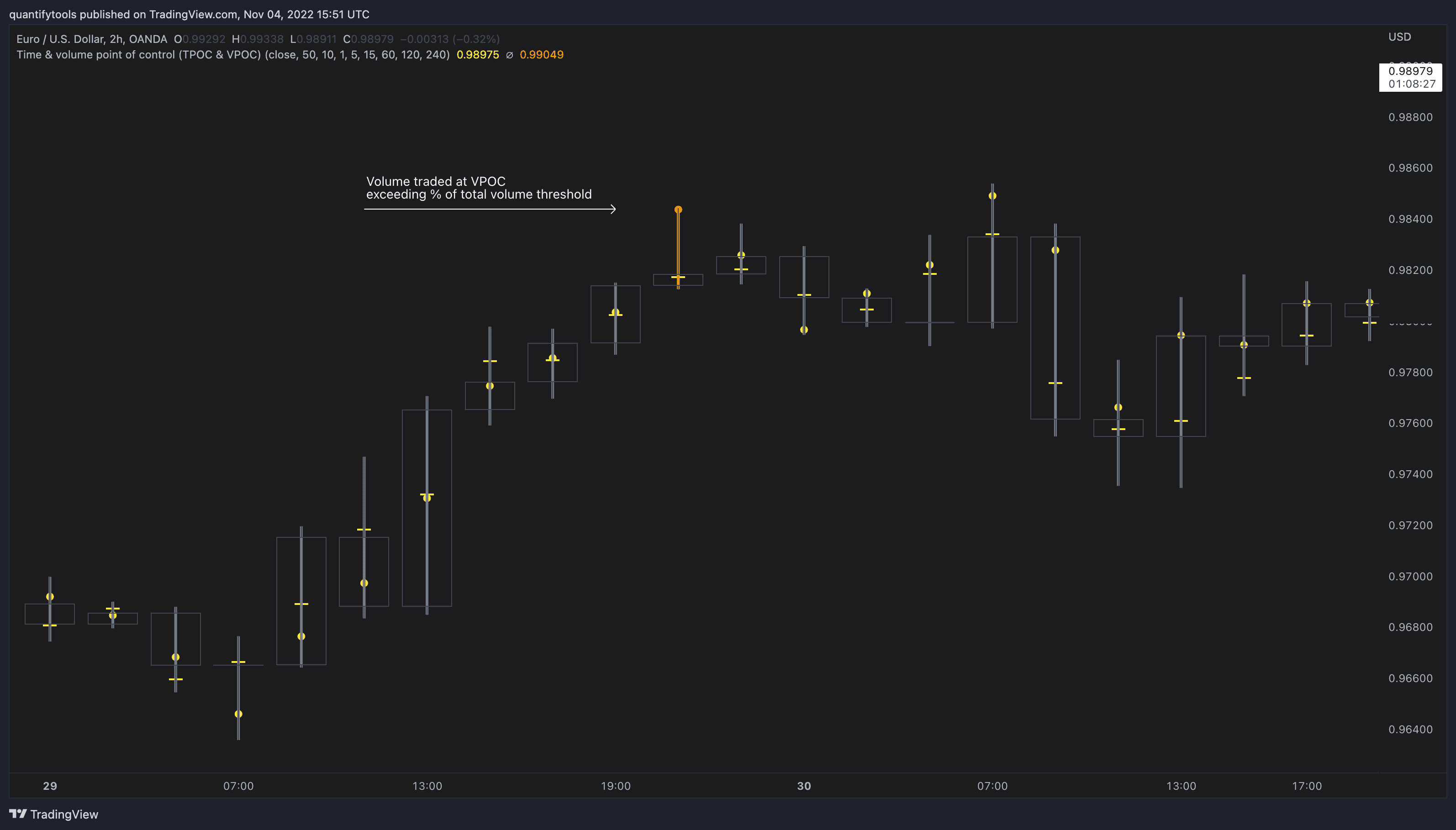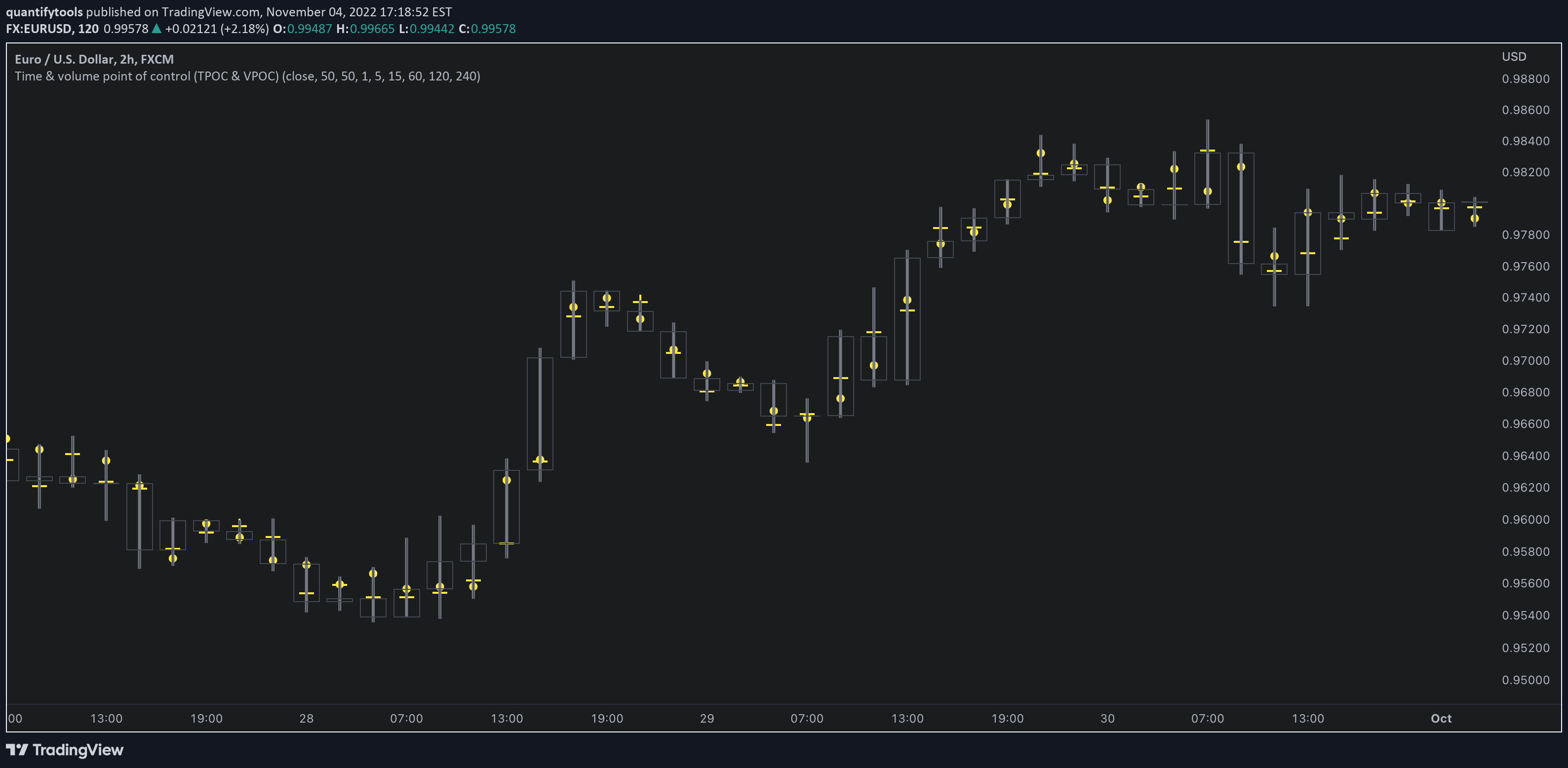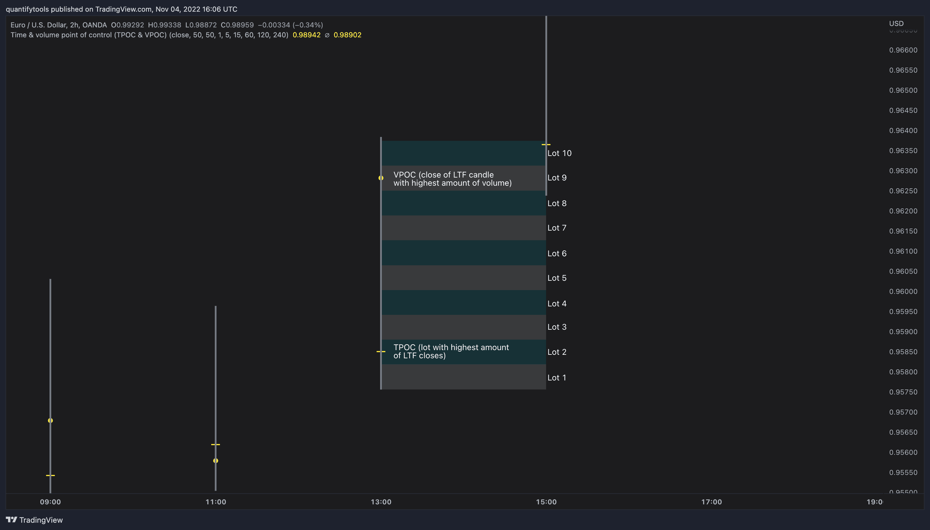 VPOC is defined by fetching lower timeframe candle with the most amount of volume traded and using its close (by default) as a mark for point of control. For TPOC, each candle is divided into 10 lots which are used for calculating amount of closes taking place within the bracket values. The lot with highest amount of closes will be considered a point of control. This mark is displayed in the middle point of a lot: