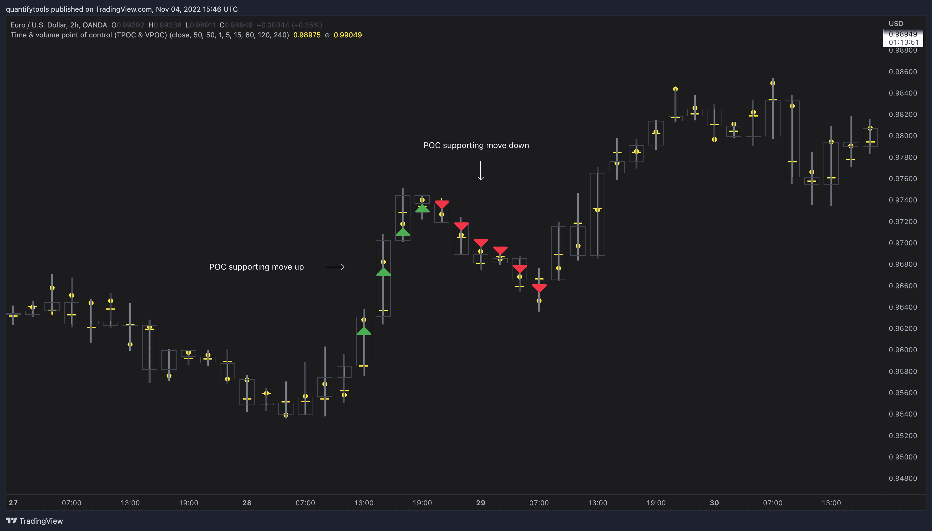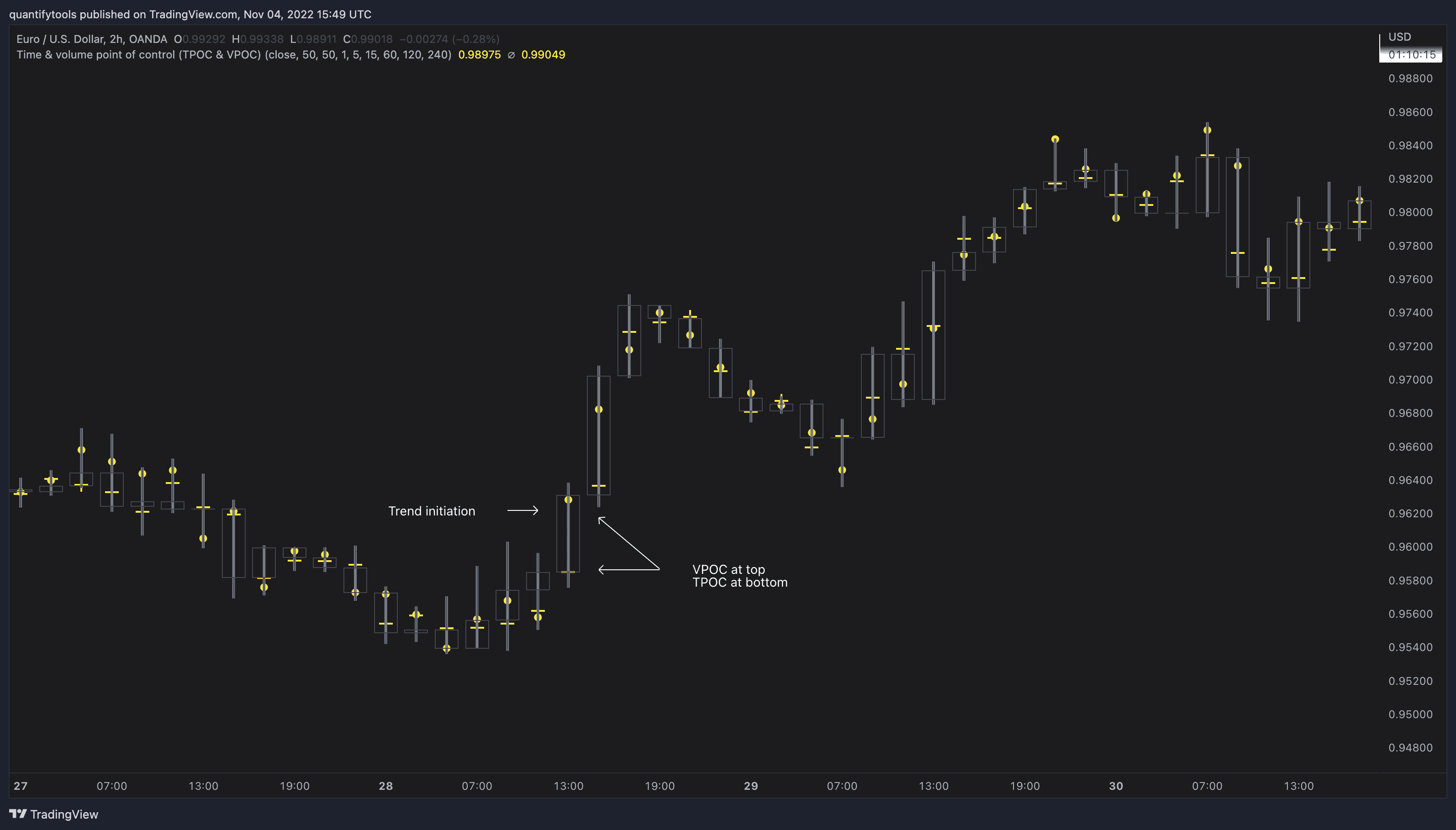 A large move that leaves TPOC behind while VPOC is supportive serves as an indication of a trend initiation. Essentially, this is one way to identify an event where price traded sideways most of the time and suddenly moved away with volume: